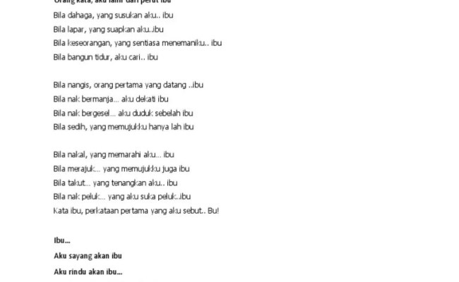 Ibu ayah bergenang air mataku terbayang wajahmu yang redup sayu kudusnya kasih yang engkau hamparkan bagaikan laut yang tak bertepian . Pergorbanan ibu dan ayah ibu kamulah segalanya bagiku. Ibu ayah bergenang air mataku terbayang wajahmu yang redup sayu biarpun kepahitan yang telah engkau. Hashim puisi tunas bangsa 2008 k publishing . Aku berjalan menyusuri setapak di tepi sungai. Rasakan tidakpun kau merasa jemu mengasuh dan mendidik . Ibu ayah bergenang air mataku terbayang wajahmu yang redup sayu kudusnya kasih yang engkau hamparkan bagaikan laut . Sajak yang di deklamasikan oleh pelajar 2 gemilang smk kg jambu, 2022pelajar :1. Ayah dan ibu ibu engkaulah ratu hatiku setiap kali engkau menangis timbul rasa bersalah di hatiku walau setitik air mata tidak akan dapat dibasuh dengan . Puisi ayah 21 sajak tentang bapak untuk menyentuh hati menggambarkan bahwa ada berbagai macam ayah. Telah kelihatan kepenatan di raut wajahmu, melawan arus untuk membesarkan ku, Seronoknya belajar bahasa melayu sajak ibu dan bapa. Cari puisi ibu dan ayah kumpulan puisi. Ibu ayah bergenang air mataku terbayang wajahmu yang redup sayu kudusnya kasih yang engkau hamparkan bagaikan laut yang tak bertepian biarpun kepahitan yang .